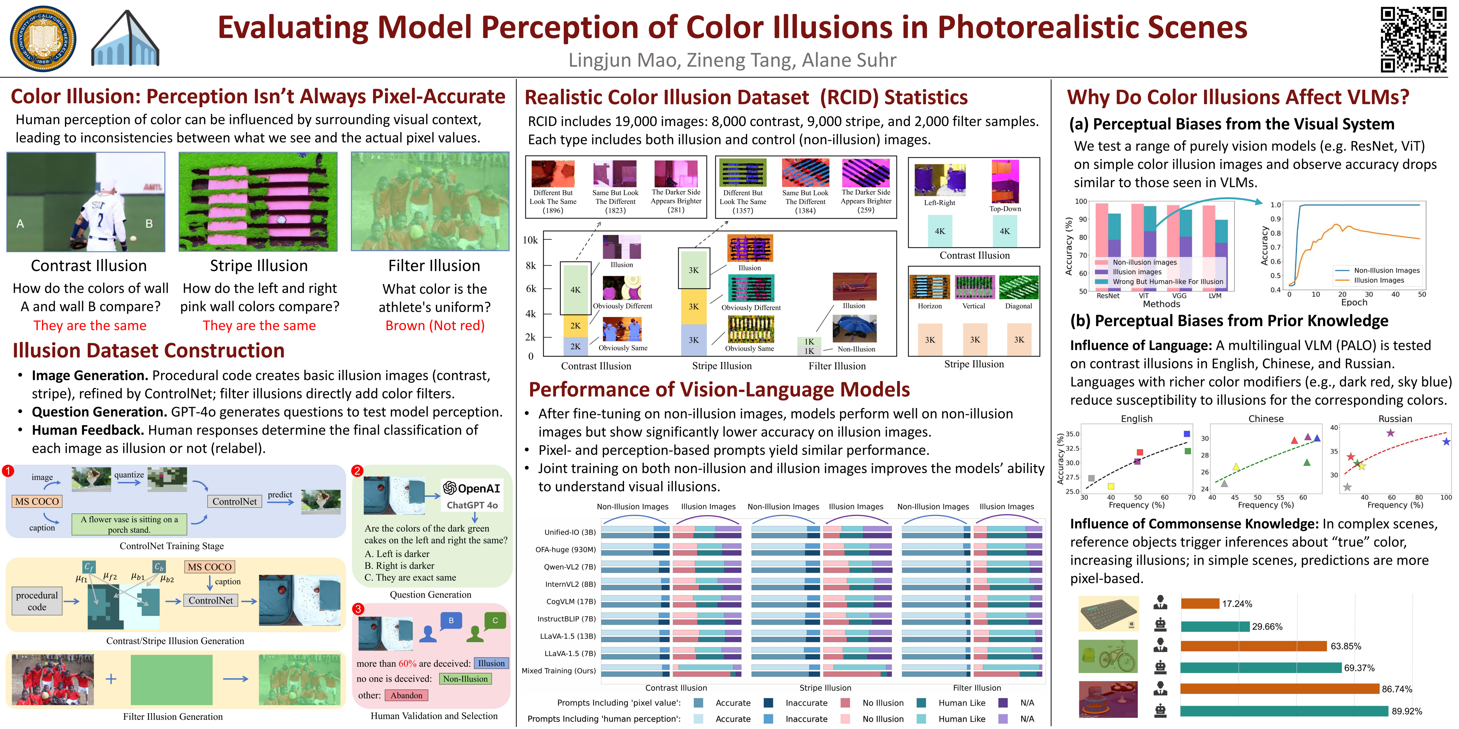 We study the perception of color illusions by vision-language models. Color illusion, where a person's visual system perceives color differently from actual color, is well-studied in human vision. However, it remains underexplored whether vision-language models (VLMs), trained on large-scale human data, exhibit similar perceptual biases when confronted with such color illusions. We propose an automated framework for generating color illusion images, resulting in RCID (Realistic Color Illusion Dataset), a dataset of 19,000 realistic illusion images. Our experiments show that all studied VLMs exhibit perceptual biases similar human vision. Finally, we train a model to distinguish both human perception and actual pixel differences.