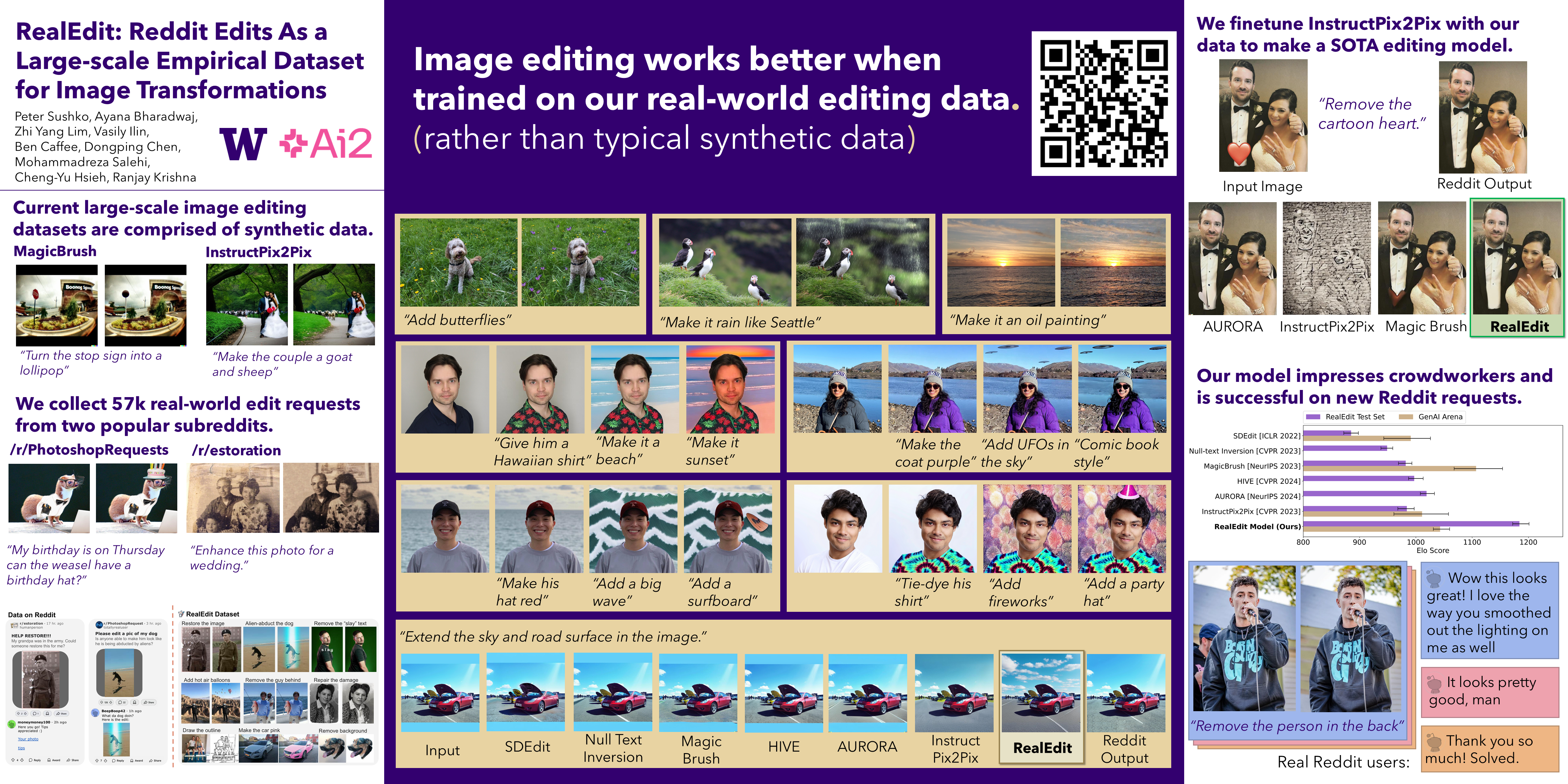 Abstract: Existing image editing models struggle to meet real-world demands; despite excelling in academic benchmarks, we are yet to see them adopted to solve real user needs. The datasets that power these models use artificial edits, lacking the scale and ecological validity necessary to address the true diversity of user requests. In response, we introduce RealEdit, a large-scale image editing dataset with authentic user requests and human-made edits sourced from Reddit. RealEdit contains a test set of $9.3$K examples the community can use to evaluate models on real user requests. Our results show that existing models fall short on these tasks, implying a need for realistic training data.So, we introduce $48$K training examples, with which we train our RealEdit model. Our model achieves substantial gains—outperforming competitors by up to $165$ Elo points in human judgment and $92\%$ relative improvement on the automated VIEScore metric on our test set. We deploy our model back on Reddit, testing it on new requests, and receive positive feedback. Beyond image editing, we explore RealEdit's potential in detecting edited images by partnering with a deepfake detection non-profit. Finetuning their model on RealEdit data improves its F1-score by $14$ percentage points, underscoring the dataset's value for broad, impactful applications.