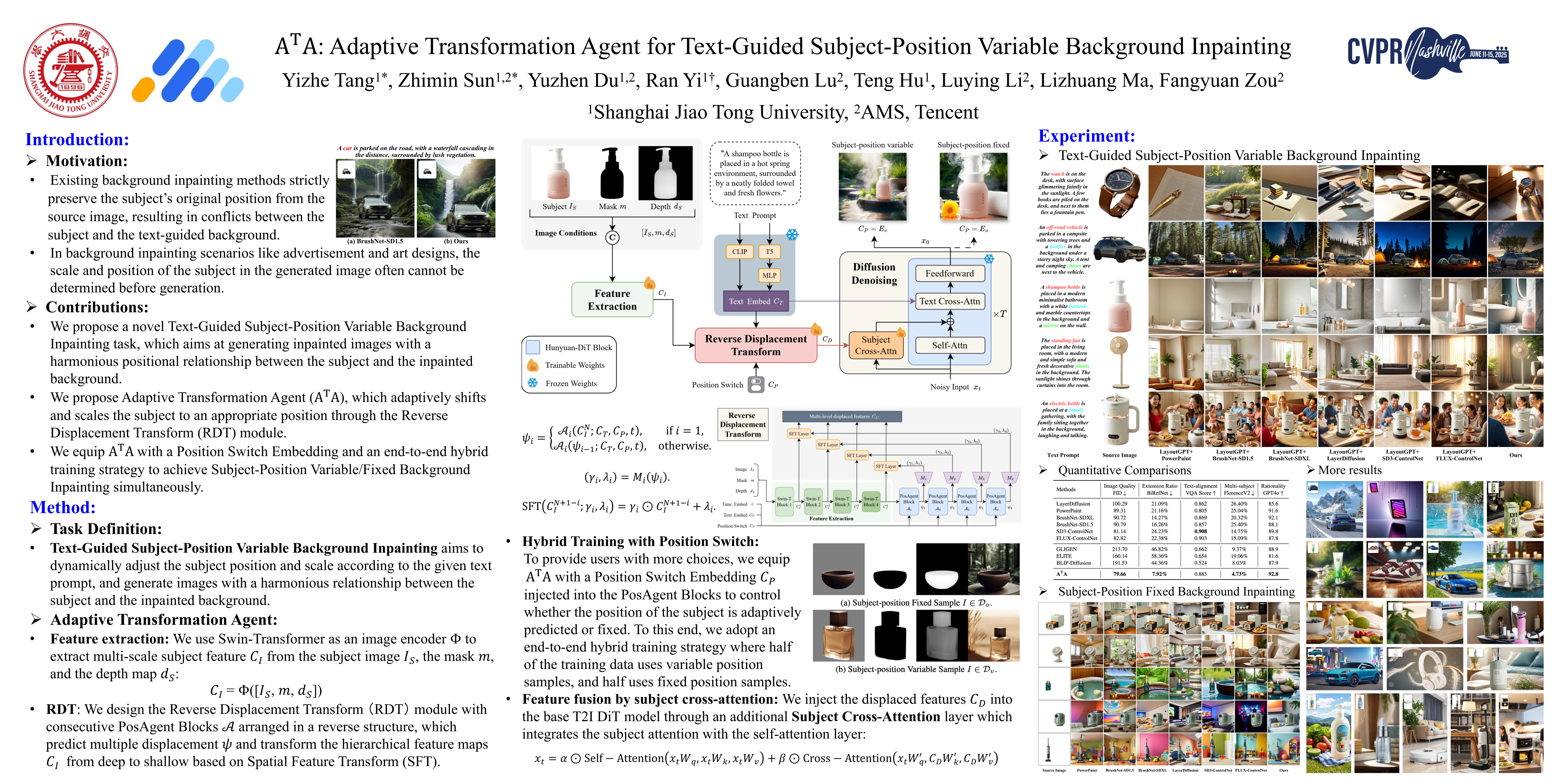 Abstract: Image inpainting aims to fill the missing region of an image.Recently, there has been a surge of interest in foreground-conditioned background inpainting, a sub-task that fills the background of an image while the foreground subject and associated text prompt are provided.Existing background inpainting methods typically strictly preserve the subject's original position from the source image,resulting in inconsistencies between the subject and the generated background.To address this challenge, we propose a new task, the ``Text-Guided Subject-Position Variable Background Inpainting'', which aims to dynamically adjust the subject position to achieve a harmonious relationship between the subject andthe inpainted background, and propose the Adaptive Transformation Agent (A$^\text{T}$A) for this task.Firstly, we design a PosAgent Block that adaptively predicts an appropriate displacement based on given features to achieve variable subject-position.Secondly, we design the Reverse Displacement Transform (RDT) module, which arranges multiple PosAgent blocks in a reverse structure, to transform hierarchical feature maps from deep to shallow based on semantic information.Thirdly, we equip A$^\text{T}$A with a Position Switch Embedding to control whether the subject's position in the generated image is adaptively predicted or fixed.Extensive comparative experiments validate the effectiveness of our A$^\text{T}$A approach, which not only demonstrates superior inpainting capabilities in subject-position variable inpainting, but also ensures good performance on subject-position fixed inpainting.